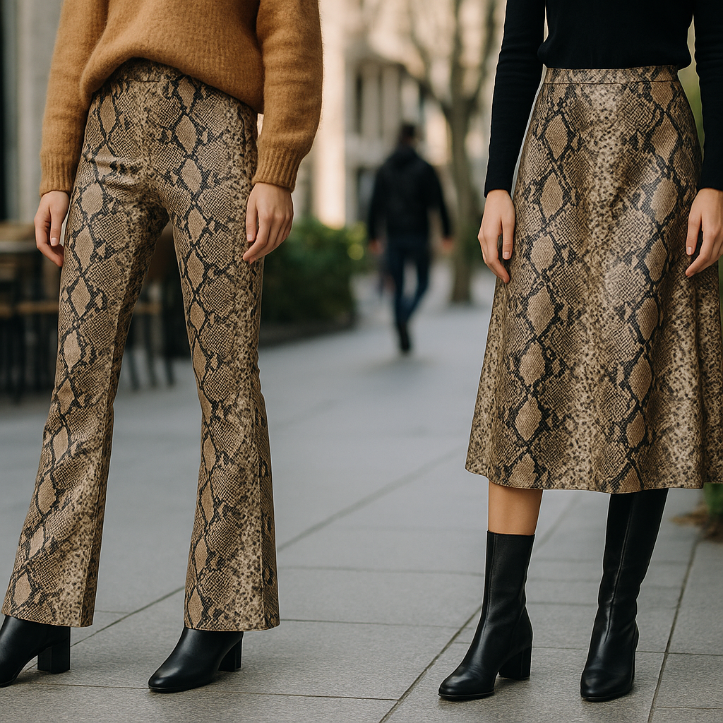 Para quienes se aventuran por primera vez en esta tendencia, las faldas y pantalones con estampado de reptil ofrecen una manera accesible de salir de lo convencional. Este tipo de prendas actúa como neutro en el armario, convirtiendo un look sencillo en una elección destacada y sofisticada. Dentro de las recomendaciones, los pantalones acampanados con estampado reptil, combinados con botas negras, han capturado la atención y pueden ser una opción excelente para crear un estilo audaz.