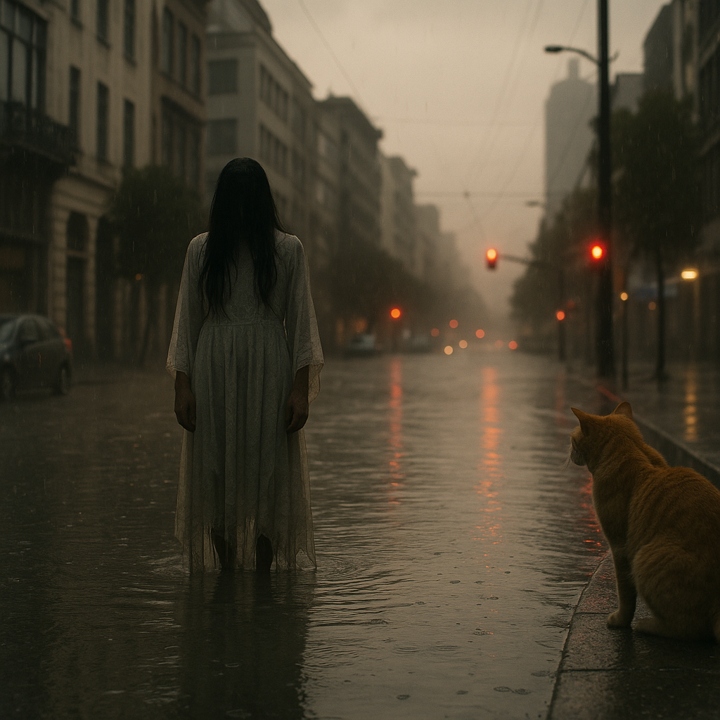 La Llorona, figura emblemática de la cultura popular, se manifiesta extraordinariamente cargada de una rabia toda contenida, desatando su llanto en una tempestad que cubre la ciudad y sus alrededores. Este lamento sin fin ha desencadenado un caos palpable; los habitantes, bien conocidos de su desgarradora presencia, enfrentan un torrente de destrucción, mientras sus rostros, salpicados de lágrimas, reflejan la angustia de quienes han sido golpeados por su llanto.