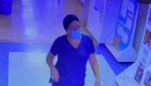 Las autoridades locales informaron que la mujer, presunta responsable, fue captada por las imágenes del hospital. Se aprecia vistiendo ropa quirúrgica azul, al igual que cubrebocas, así como lentes transparentes.