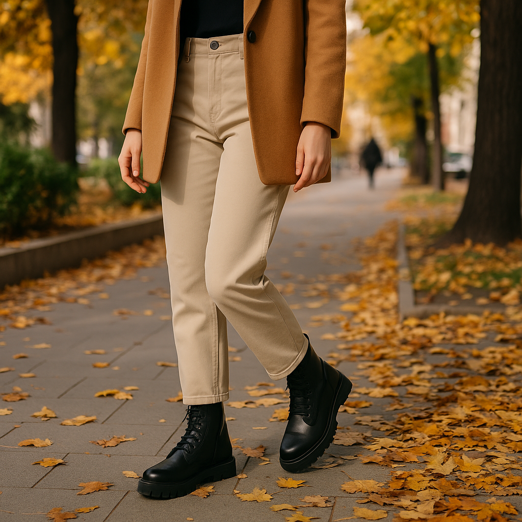 Por tanto, al considerar cómo llevar estos pantalones beige, la combinación ideal consiste en pantalones fluidos de este tono, acompañados de botas negras de suela plana, ofreciendo no solo elegancia, sino una adaptabilidad que se alinea con las exigencias del clima y las tendencias de moda actuales.